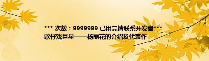 本文*** 次数:9999999 已用完请联系开发者*** 歌仔戏巨星——杨丽花的介绍及代表作到此分享完毕,希望对大家有所帮助。