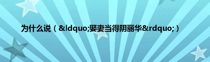 最佳答案大家好,综合小编来为大家讲解下。为什么说,“娶妻当得阴丽华”这个很多人还不知道,现在让我们一起来看看吧!1、 当官就要当执金吾,娶妻子就要娶阴丽华。执金吾:秦汉时率禁兵保卫京城和宫城的官员,阴丽华:东汉开国皇帝光武帝刘秀的结发妻子,后被封为皇后。2、 这句话是东汉开国皇帝...