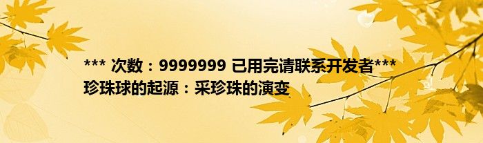 本文*** 次数:9999999 已用完请联系开发者*** 珍珠球的起源:采珍珠的演变到此分享完毕,希望对大家有所帮助。