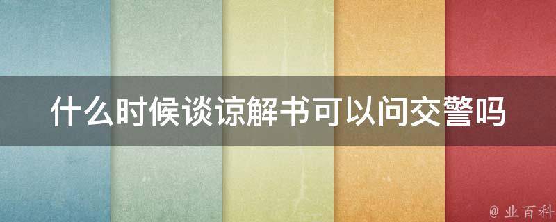 什么时候谈谅解书可以问交警。交通摩擦中的当事人可以向交警咨询谅解书的使用和适用情况。谅解书是一种书面协议,用于解决交通事故或纠纷,双方当事人通过签署谅解书达成和解并对事件的责任和赔偿等事项进行约定。交警通常是处理交通事故报案和记录的人员,他们也可以提供相关的建议和指导。当事人可以向交警咨询谅解书的合理性、意义和适用条件,以及如何填写和执行谅解书。交警可能会就具体案情提供专业建议,并解答当事人对谅解书的疑问。