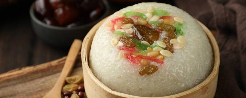 用料:白糯米300g、白糖/红糖25克、安佳黄油15克、莲子7个、豆沙馅150克、葡萄干14个、枸杞6个、巴旦木6个、核桃仁8个、红枣4颗。