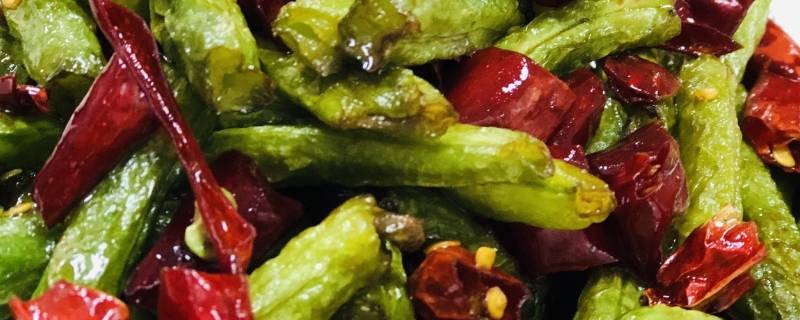 四季豆洗净沥干放到油锅里炸制,炸到豆角外皮皱巴巴捞出沥油。