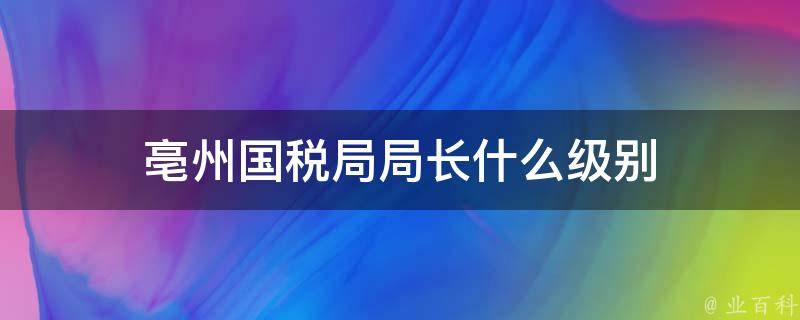 亳州国税局局长是正部级,属于三级官员。亳州市国家税务局于2000年5月成立,是主管亳州市国家税收工作的行政职能部门,下辖开发区国税局、谯城区国税局、涡阳县国税局、蒙城县国税局和利辛县国税局。