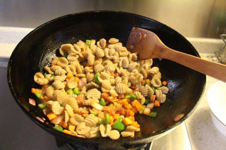 7、锅中放入适量油,放入葱姜蒜末和五香粉爆香,然后放入菜丁煸炒,待菜丁断生后倒入2小勺老抽。