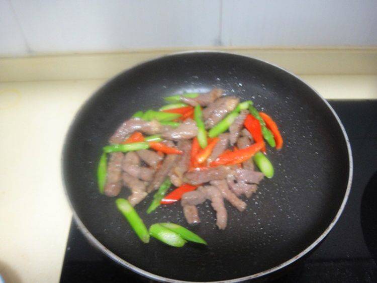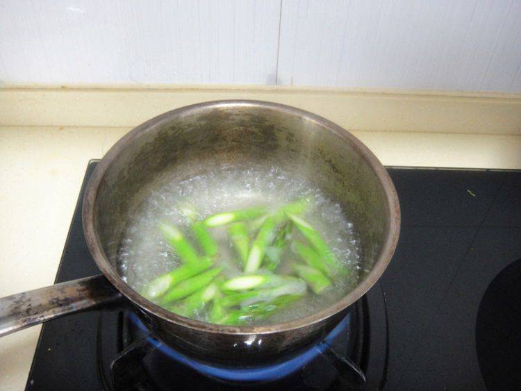 2、芦笋洗净切断,彩椒洗净切片,生粉加入清水融化待用。
