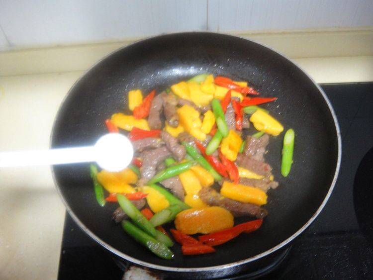 1、食材准备:牛排150克、芒果200克、芦笋2根、橄榄油、盐、彩椒、水淀粉各适量。