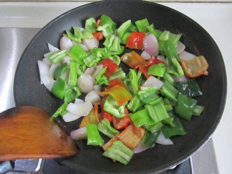 3、洋葱爆出香味且微微发软后下入青红椒翻炒。