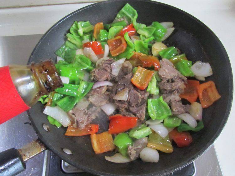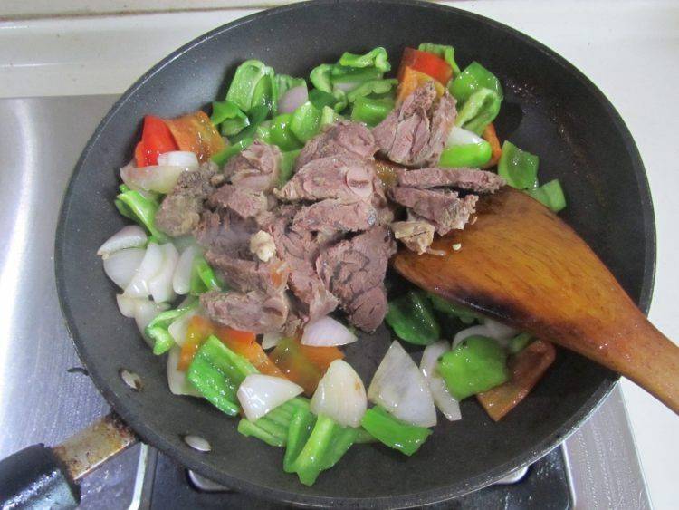 4、翻炒几下后下入切好的驴肉片一起翻炒。