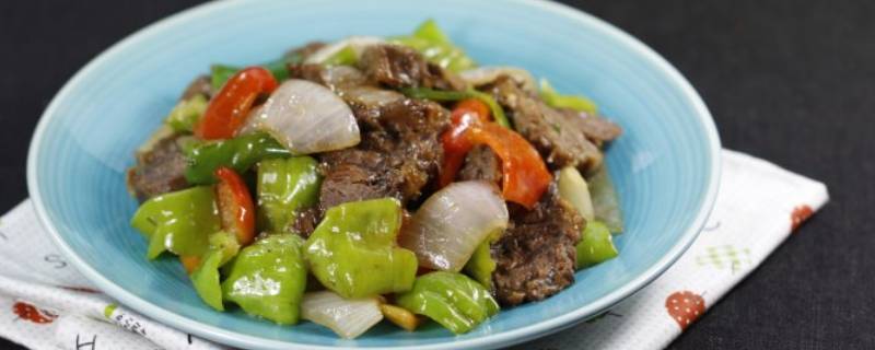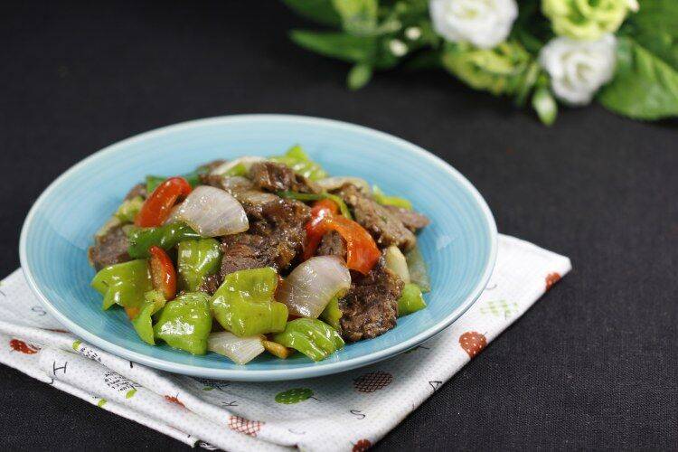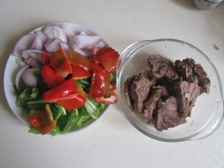 1、食材准备:熟驴肉1块、青椒2个、洋葱1个、红椒1个、油、盐、蚝油各适量。