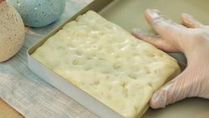 6、带上手套,将稍稍放凉后的牛轧糖取出,放在方形盘里塑形。