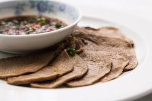 1、准备材料:牛舌一个、干红辣椒3根、桂皮1片、花椒15个、大料2个、香叶2片、大蒜3瓣、酱油少许。