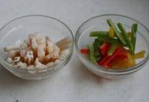 藕苗切段、彩椒切条。