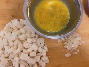 2、把馍馍切成小块,葱切小片,鸡蛋中加入一小半勺盐、加入花椒粉去腥搅拌均匀。
