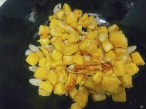 4、锅中倒油,油热倒入拌好的馍馍翻炒,翻炒一分钟倒入葱花,加入少许盐,继续小火翻炒至金黄即可。