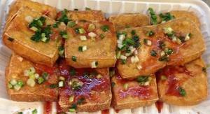 5、热油锅加入蒜蓉爆香,加蚝油、茴香和小半碗水,水开后放入炸好的臭豆腐,倒入淀粉水勾芡,放香菜装盘即可。