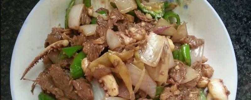 1、准备材料:牛肉300克、鱿鱼适量、青椒适量、姜适量、蒜适量、料酒适量、蚝油适量、油适量、盐适量、生粉适量、酱油适量、洋葱半个。