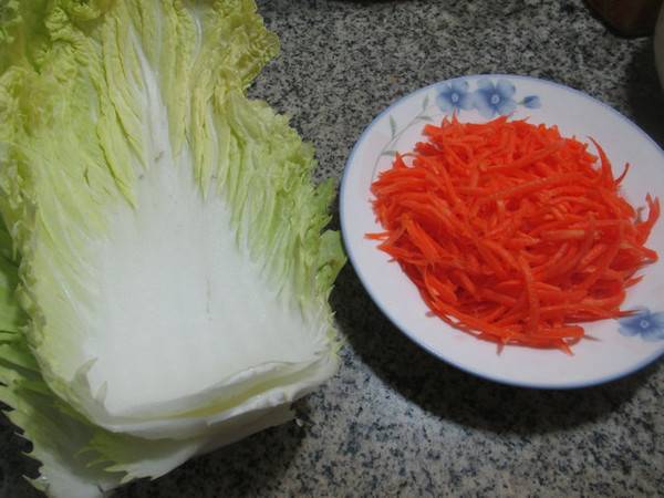 1、准备材料:大白菜340克、胡萝卜170克、油适量、香醋适量、白糖适量、盐适量、味精适量。