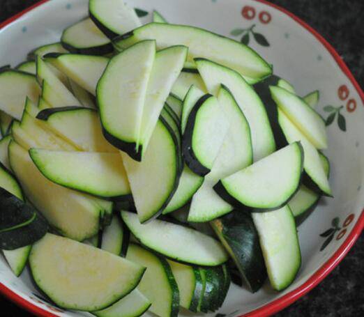 4.大蒜香气飘香,微微发黄后将节瓜片倒进去,一起翻炒至均匀裹上油。