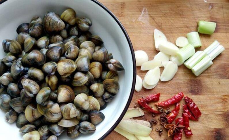 1、沙蚬放到清水中,让它吐吐泥沙,可以放几滴油,吐得更快。辅料备齐切好备用。