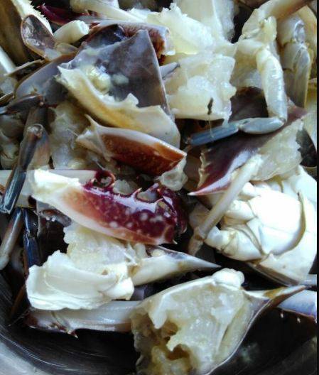 用料:海螃蟹1斤、辣椒2条、蒜泥10克、盐适量、生抽2茶匙、花生油1茶匙、姜2块、花椒小量、料酒1茶匙。