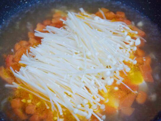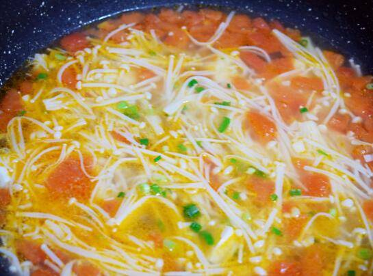 1、准备食材:番茄1个、豆腐250克、金针菇200克、蒜10克、盐、水淀粉、水800毫升、油、葱。番茄先在顶部切十字,用开水烫至皮开,撕去皮切成小块,嫩豆腐切小块,金针菇去根部洗净备用,蒜切末,葱切末。