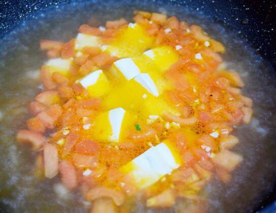 3、放入番茄翻炒至出汁。加入800毫升的水。
