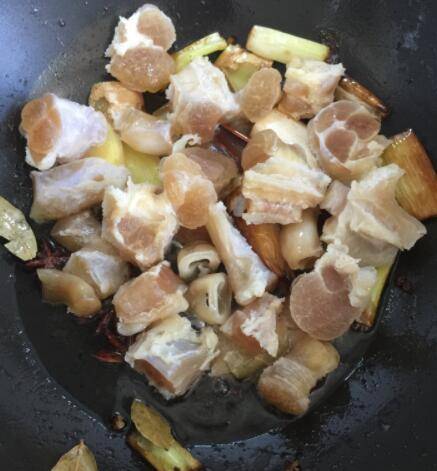 5、热锅冷油,放入葱段姜片爆香,再放入大料,桂皮,香叶等香料,倒入牛蹄筋翻炒。