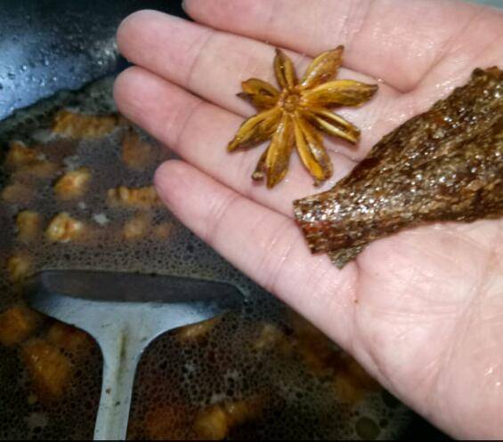 6、加入三饭碗水,放入八角、桂皮,加盖小火煮五十分钟。