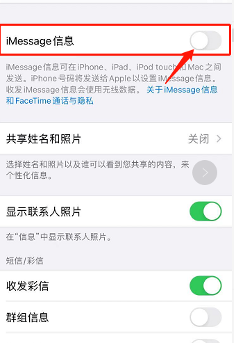 信息界面点击iMessage信息后面的圆点,圆点变为灰色即可解决手机发送不了短信的问题。
