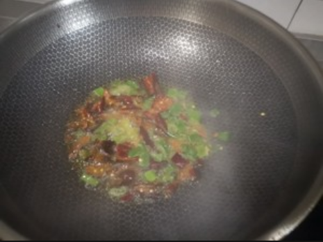 4、锅中烧热油,下入辣椒,姜翻炒。