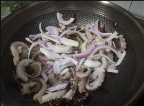 5、下入八爪鱼翻炒几下,加入圆葱。