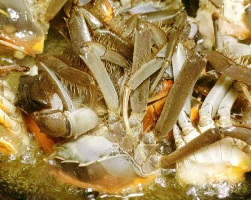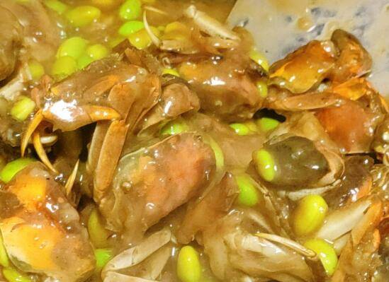 新鲜毛豆剥皮取豆,河蟹对半切开去腮。