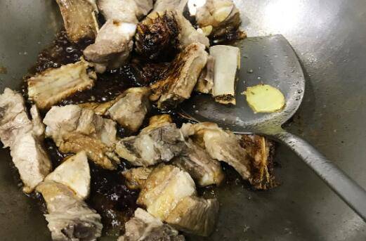 起油锅,放入姜片,再放入细砂糖、排骨,进行翻炒。