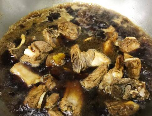 放入花生米,转小火慢煮,一直煮到水差不多收干。