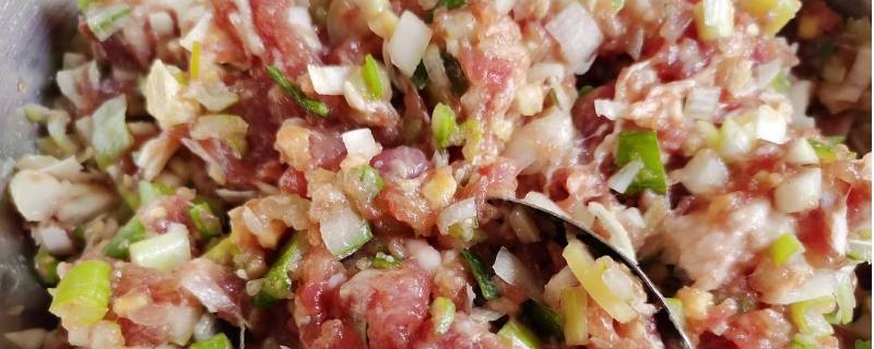 将拍扁的大葱剁入肉里,同时加入姜一起剁馅,将葱姜慢慢剁融合于肉里,为了保持剁的均匀,剁好一面,用刀把下面的翻过来继续剁,如此往复,将肉馅剁细腻即可。