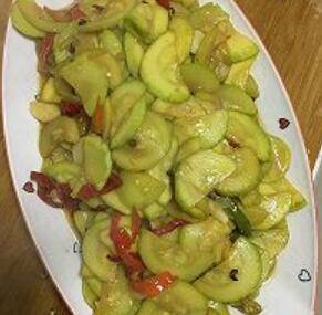 用料:青椒、花生油、盐、鸡粉、茭瓜2~3根、蚝油、花椒、葱姜蒜、干辣椒、料酒、醋。