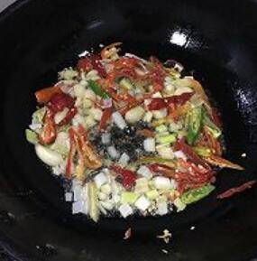 3.开火,热锅凉油,先下葱姜蒜、辣椒等炒出香味。