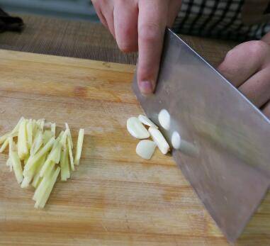 6、放入切好的蒜片、姜丝。倒入开水大火煮制。