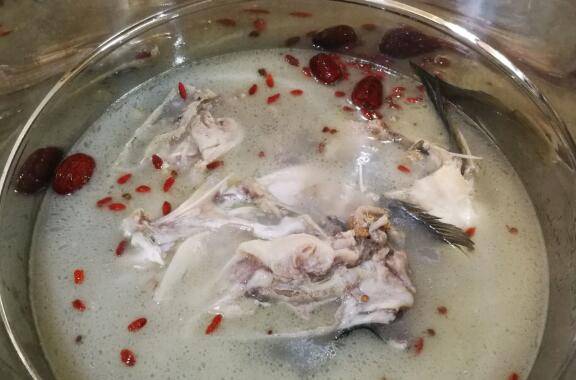 7、把鱼头烧开,倒入热好的闷罐锅中,放入枸杞红枣开炖。
