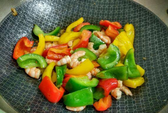 用料:虾250克、青椒半个、红椒半个、黄椒半个、大蒜2瓣、盐1小勺、鸡精半小勺、蚝油半勺、酱油半勺、植物油适量。