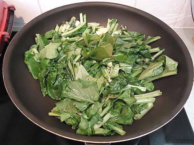 2、萝卜叶子洗干净切段,将叶子与梗分开,蒜头剁碎。