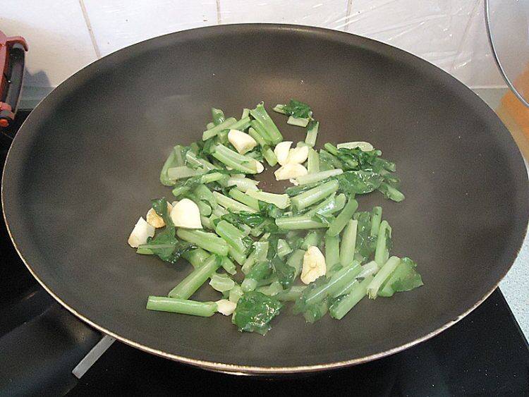 3、烧热锅倒入橄榄油放入蒜头爆香。