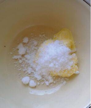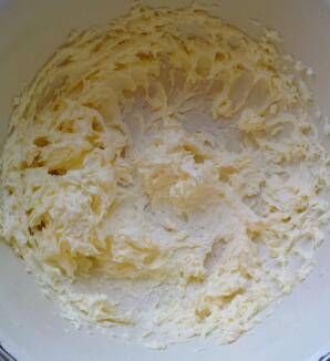 1、黄油从冰箱里拿出来以后提前软化,加入细砂糖,用打蛋器稍微打发。