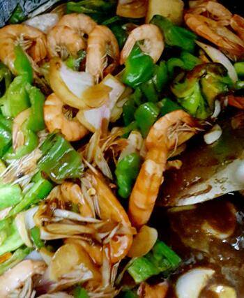 虾500g、青椒2个、洋葱小半个、大葱适量、大蒜1个、香菜适量、小米辣3个、干辣椒段适量。