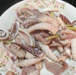 5、锅里放水烧开倒入鱿鱼,放几根姜丝一起焯。