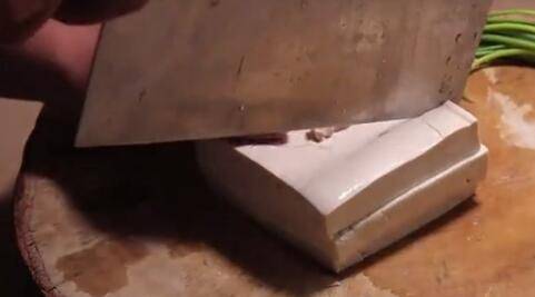 首先将块状的豆腐切小备用。