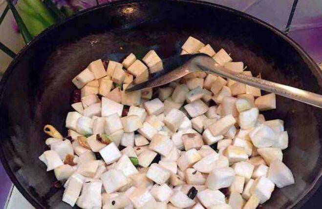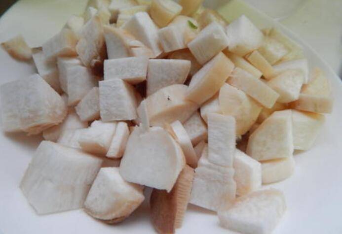 2、杏鲍菇洗净切成丁。