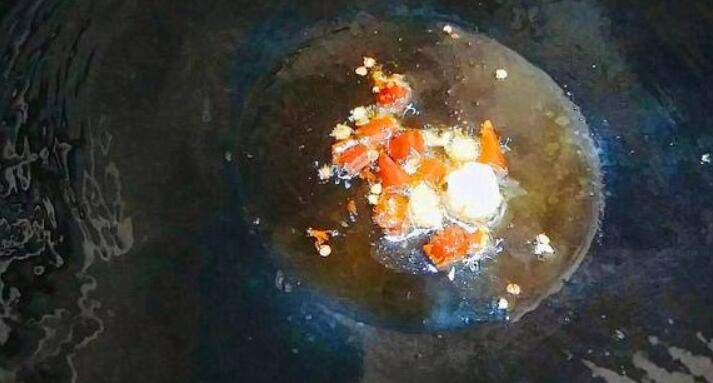 4、锅热油,爆香蒜片。