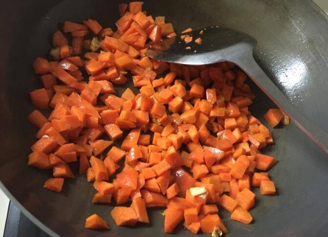5、放入胡萝卜丁翻炒变色。