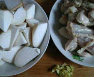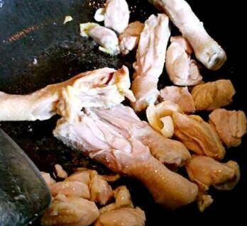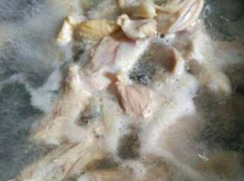 先将鸡腿切成块,放锅里煮沸,焯下水洗净。